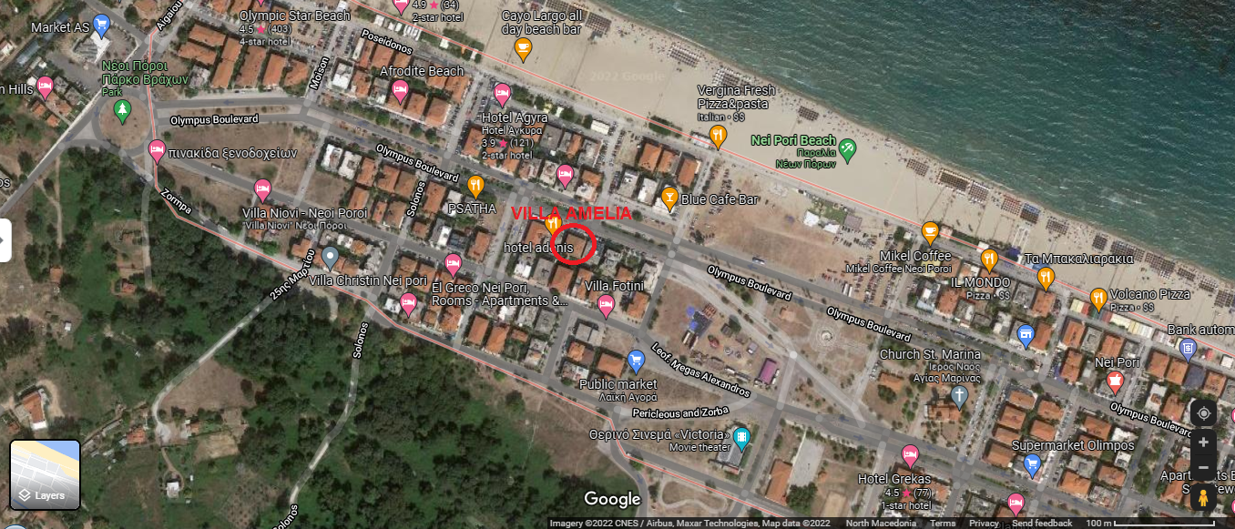 ВИЛА АМЕЛИЈА се наоѓа на 80 метри од плажа. Распoлага со трикреветни студија и петокреветни дуплекс апартмани. Секоја соба има балкон, комплет опремена кујна со фрижидер, бања, ТВ, клима (се доплаќа 8 евра на ден) и Wi-Fi.