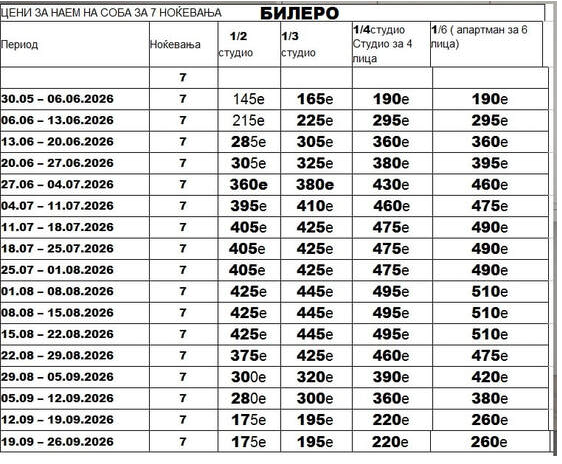 - Цените се дадени за наем на соба/апартман за 7 ноќевања/8 дена (плаќањето е во денари (1 еур = 62 мкд.)