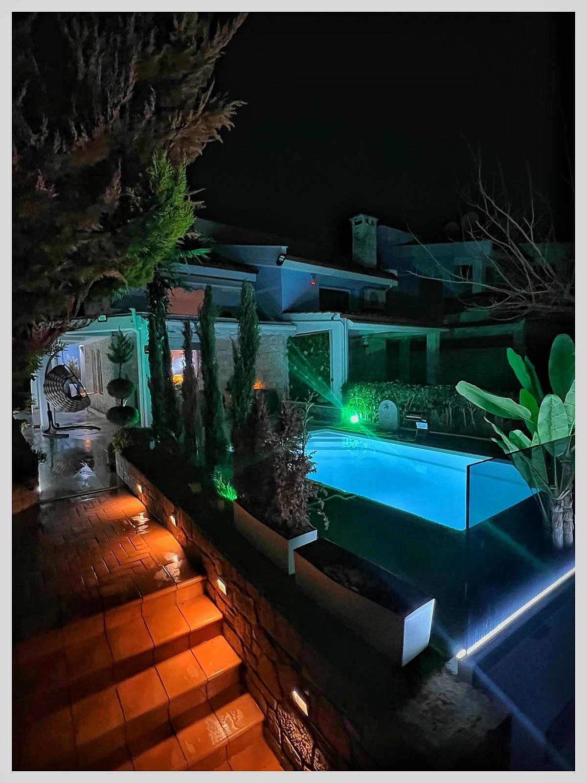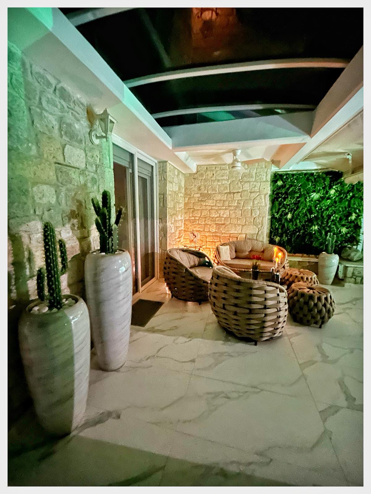 - Ниско приземје: Голема спална, дневна со петосед на спуштање, купатило, iPTV 75', двор со гарнитура за седење.